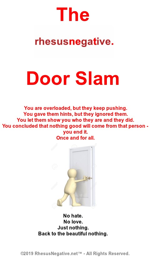 Many of you have disagreed, but the ones in agreement were so adamant, I need to highlight it again. When we have given so much rope and still the person will hang, we let him go. We take crap as we don't argue. We let them get away with things and step over us... until... it's over and there is no turning back. The grey-area-friends life deals people are not for us. You are friend or you stay away. No in-between. We expect as we give of ourselves without hesitation and condition. All or nothing. The doorslam is the last episode if it comes to that, but when it does, it is final.